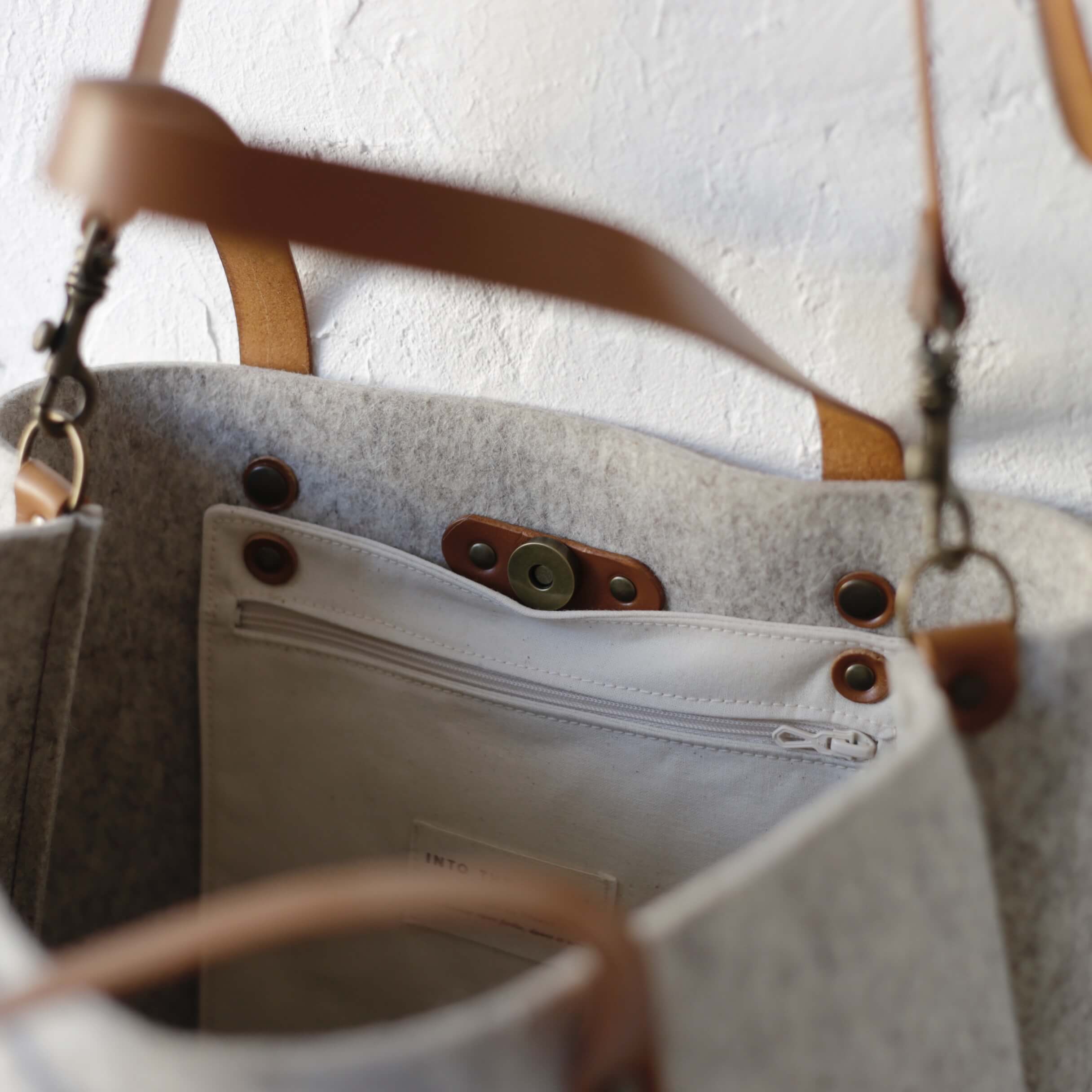 Le cabas en feutre de laine se porte à l’épaule, à la main ou en bandoulière. Poche intérieure zippée pour les clés et le portable. Anse réglable amovible avec mousquetons. Se ferme avec une pression aimantée.